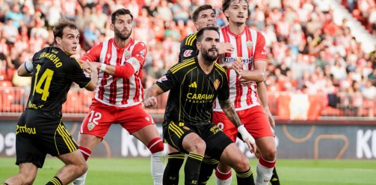 De nuevo Baptistao, en el minuto 10’ remata de cabeza por arriba del travesaño. El equipo maño se perdía en la tela de araña tejida por el centro del campo del Almería, incapaz de saltar ni una sola línea que permitiera llevar el balón a las zonas calientes.